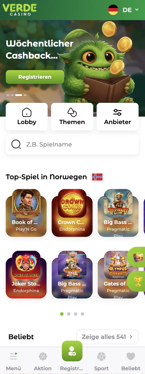 - Tippe auf das Menü, um Spiele, Aktionen und die Kasse zu öffnen, und nutze Verdecasino login, um dich in dein Konto einzuloggen.